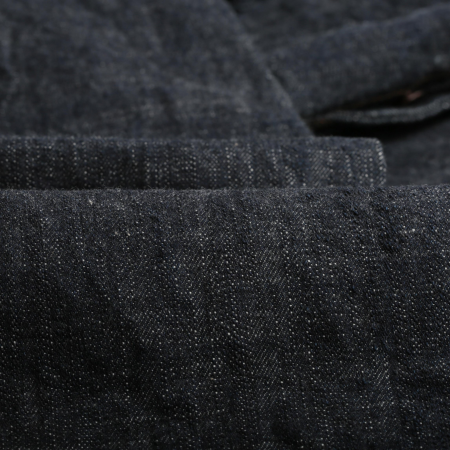 This exceptional denim is made from a blend of American and Australian cotton, rope-spun and dyed with natural indigo. The irregularity of the cotton threads used, combined with the very low-tension weaving on the legendary Toyoda G3, results in a textured canvas with a unique relief. Both granular and rough, it remains nevertheless fluid thanks to an ideal weight of 14oz, a medium weight that can be easily worn throughout the year. The pre-washing process (One Wash) also helps to remove the stiffness and crispness of the denim to offer a comfortable wear right away.