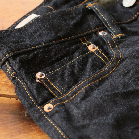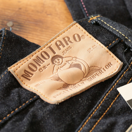 On retrouve la couture signature rose de Momotaro sur l'entrejambe, des rivets en cuivre et un patch en cuir au tannage végétal.