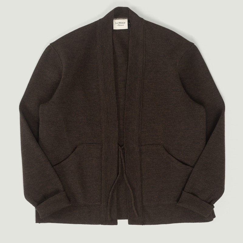 For this reinterpretation, we have adapted the modern Noragi using one of Le Minor’s signature knits: the Milano knit, previously seen on their Blazer and Coach Jacket. It is one of the most refined knitting techniques—highly structured and time-consuming to produce—giving the garment a genuine drape. More precisely, the body and sleeves are knitted in Milano stitch, while the collar band is made in a more traditional 1x1 rib. This rib provides additional flexibility, gently wrapping around the neck like a shawl collar, while its width enhances the overall structure of the piece.