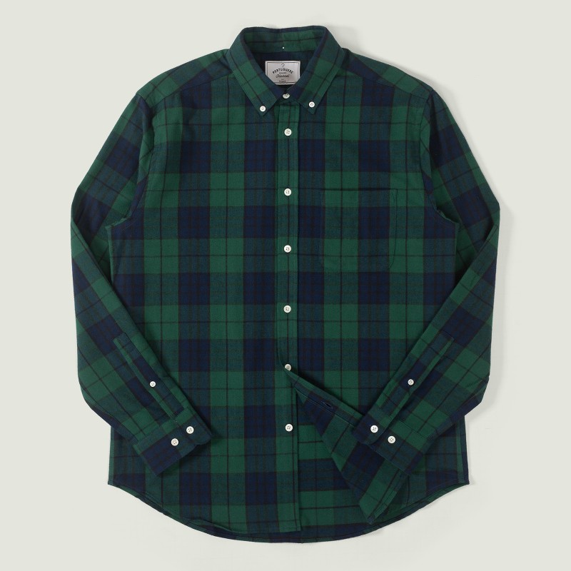Here, we find a classic shirt, featuring an American collar and a chest pocket. It is presented in a Tartan blackwatch flannel fabric with shades of blue, green, and black. It is notable that the pattern of the chest pocket blends seamlessly with that of the shirt.