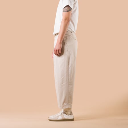 Its Loose Tapered cut offers a great sense of comfort and lightness despite the density of the twill used. The leg ends are slightly tapered, without altering the overall volume, and the length, deliberately "cropped", finishes with a hem sewn with excess fabric, allowing the trousers to be lengthened as desired. The overall shape, with a pronounced oval, gives an oversize effect without the need for upsizing.