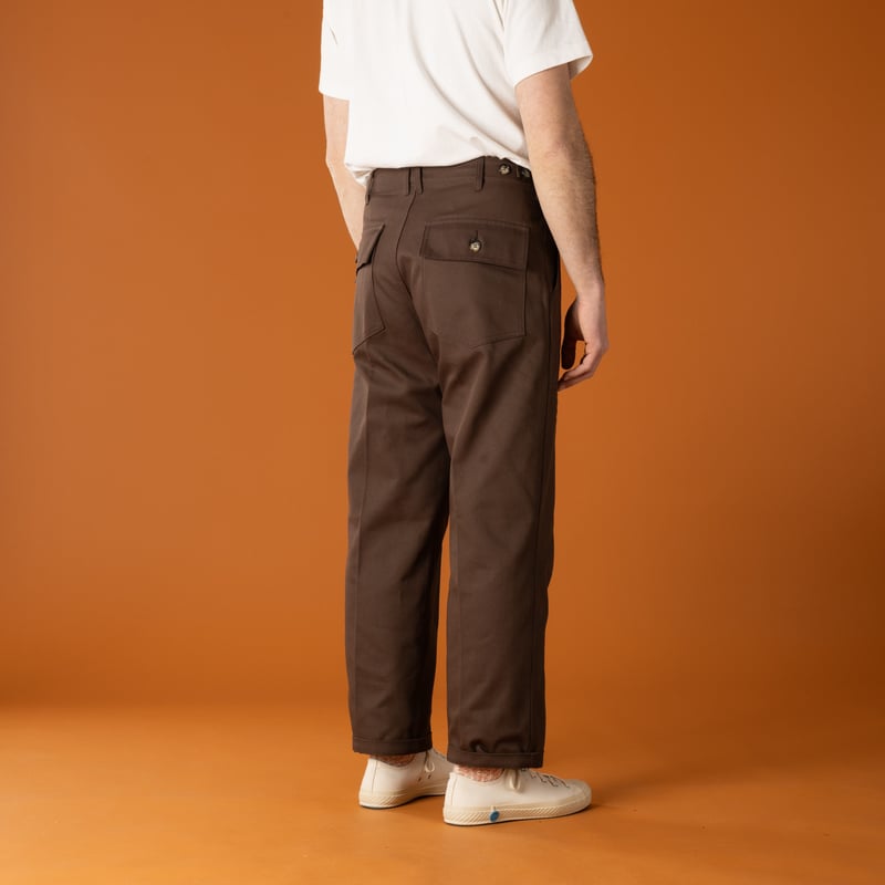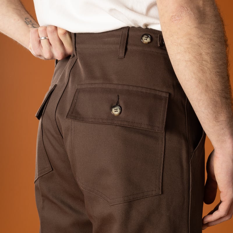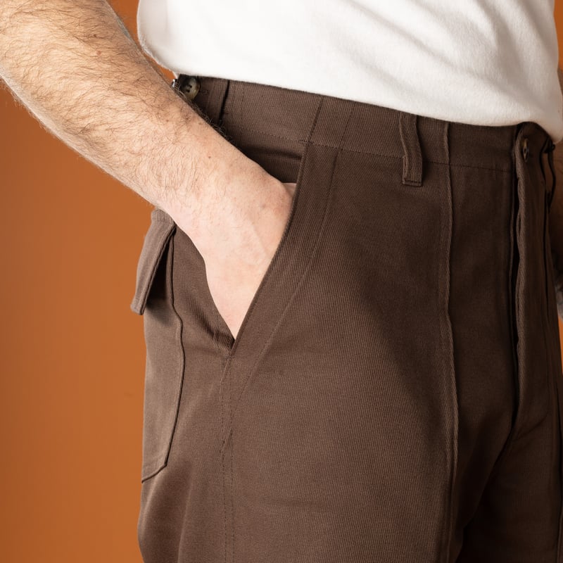 The Fatigue Pant, also known as "Baker Pant" or "OG-107" for its original "Olive Green" color, needs no introduction. It is the quintessential military-inspired trouser. Emerging in the 1950s, this model was developed by the US military wanting to revise their uniforms post-World War II. They needed a lighter, more practical, more comfortable pant, thus significant improvements were necessary. The Fatigue Pant so effectively met these criteria that it became the longest-used uniform model by the US army. It's hard to imagine a more reliable and timeless pair of trousers.