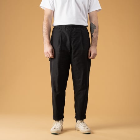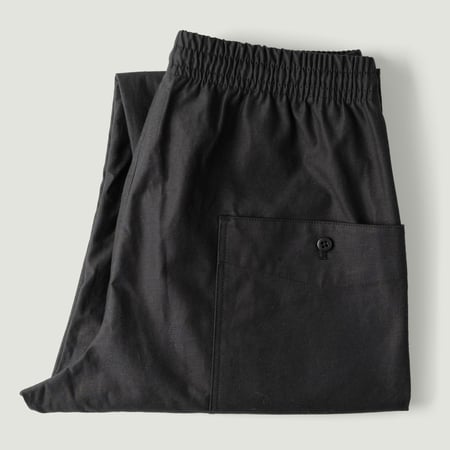 The Umps Pants derives its design from the pants worn by sports referees ("Umps" for "Umpire"). It features a loose fit, high at the waist, comfortable on the thigh, and tapers down at the lower leg, with an intentionally short leg length and an elastic waistband that can be tightened with a drawstring. The 2 front pockets are slanted, accompanied by 2 large buttoned back pockets, mounted with a bellows design to provide more depth and durability.