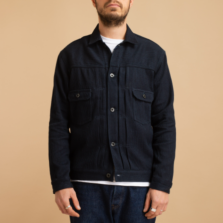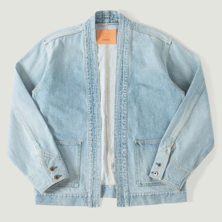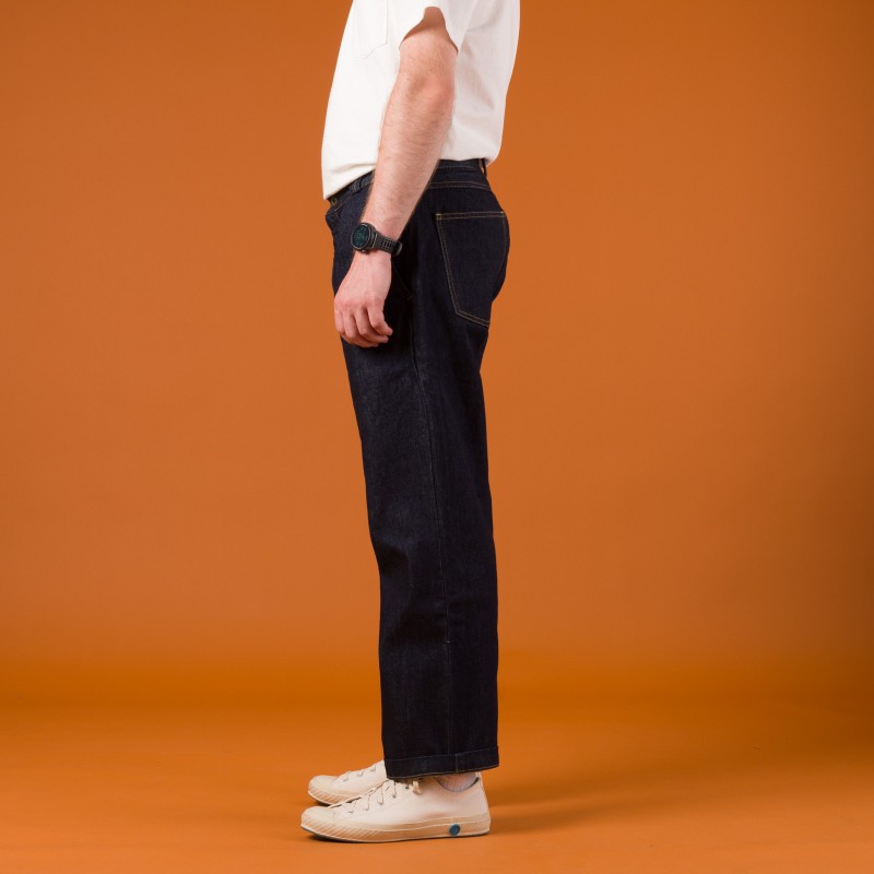 They are made from non-selvedge denim weighing 13oz, woven from organic cotton that is both soft and durable. The warp (outer) yarn is deeply indigo-dyed, while the weft (inner) yarn is left white and undyed. Thanks to the rope dyeing technique, this indigo will gradually fade over time, developing a patina with varied blue tones. The tobacco-colored topstitching echoes the original golden hues used in denim seams, initially chosen to blend in discreetly with metal rivets.