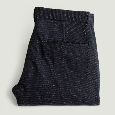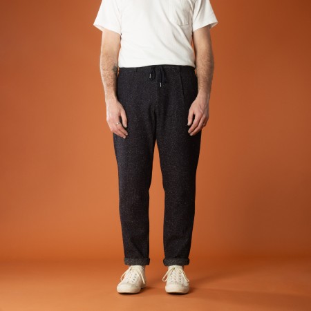 The 13oz Denim Tuck Pants from Japan Blue Jeans is a pant positioned between chino and jeans, offered in a clean raw black. With waist pleats, it provides a loose yet controlled silhouette, both relaxed and refined, ensuring comfort and freedom of movement without compromising structure.