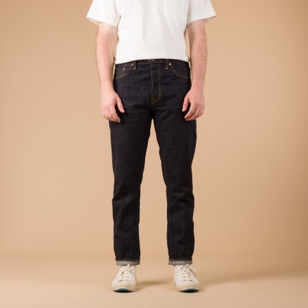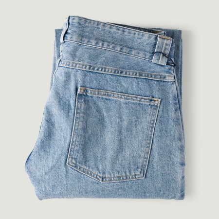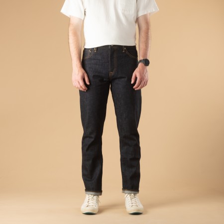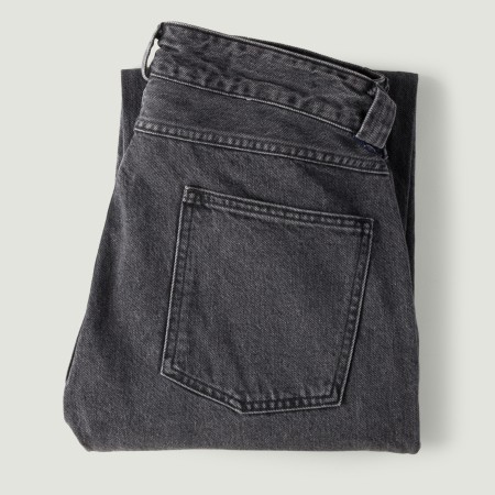 It is made from a non-selvedge 13oz denim woven from soft and durable organic cotton. The warp and weft yarns are dyed with sulfur black, resulting in a deep, uniform color. Thanks to the dyeing technique used, known as "rope dye", the color will gradually fade over time, creating a patina with varied grey shades. Tone-on-tone chainstitching and seams further enhance the overall uniformity, making these pants a reliable choice for those seeking both versatility and durability.
