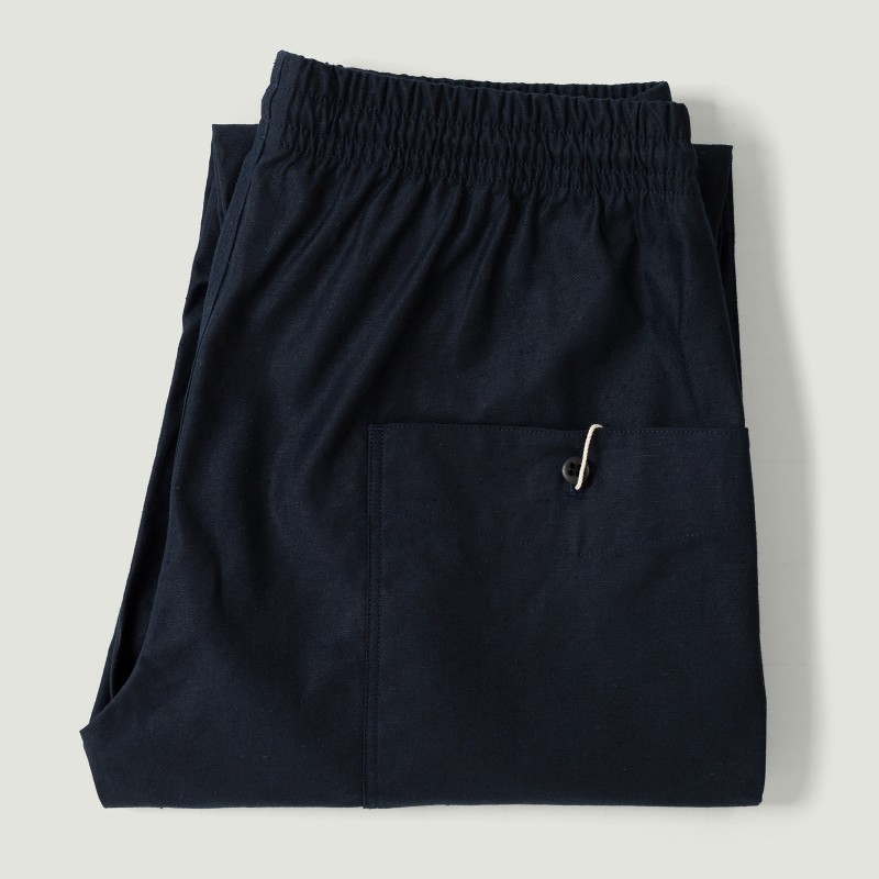 The Umps Pants design is inspired by sport umpires' trousers ("Umps" stands for "Umpire"). It features a loose fit, high on the waist, comfortable at the thigh and tapering towards the calf, with intentionally short leg length and an elastic waistband that can be adjusted with a drawstring. The 2 front pockets, angled for ease, accompany 2 large buttoned gusseted back pockets, offering more depth and durability.