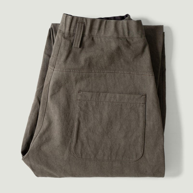 These Rookie Pants are voluminous pleated trousers, ideal for the summer season. They are made from a cotton and linen canvas dyed using sulfur dye. Sulfur dyeing, also known as "damage dye," is characterized by a special dyeing method that deliberately creates irregularities and streaks to give the fabric an even rougher appearance. The design is based on the loose-fitting pants worn by rookie baseball players in the United States during the 1930s and 1940s. Its very clean elastic waistband, without button or fly, along with its relaxed fit, makes it an extremely easy pair of pants to wear.