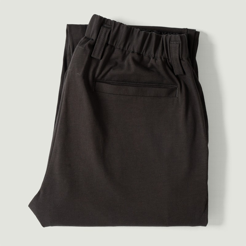 These Grace Trousers feature a tapered fit, ideal for the summer season. They are made from a specific cotton jersey called "Grace Tenjiku", whose surface has been treated to remove fuzz, resulting in a smooth and slightly shiny appearance. This process gives the fabric a cool and silky feel while maintaining good breathability, making these trousers particularly comfortable to wear in warm weather. The design draws inspiration from both sportswear and tailoring, blending classic codes with a modern and refined approach.