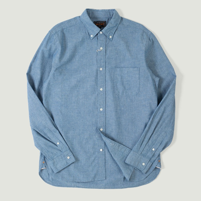 Respectant scrupuleusement leur souhait de créer des designs intemporels basés sur les grands classiques du vestiaire masculin, Beams Plus propose la BD Oxford Shirt, fabriquée selon les codes des Button Down classiques à partir d'un tissu chambray selvedge 100% coton, teint à l'indigo.