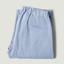 Sa coupe se distingue par un pli inversé qui surélève légèrement la partie supérieure pour offrir plus d’aisance au niveau des hanches et des cuisses, tout en se resserrant progressivement du genou à l’ourlet pour créer une silhouette nette et harmonieuse. La taille élastiquée avec cordon de serrage assure un confort optimal tout en maintenant une forme soignée. Ce pantalon dispose de poches arrière fendues classiques. Entièrement fabriqué à la main par un seul tailleur, chaque pièce est unique et accompagnée d’une étiquette mentionnant les noms des artisans ayant participé à sa confection.