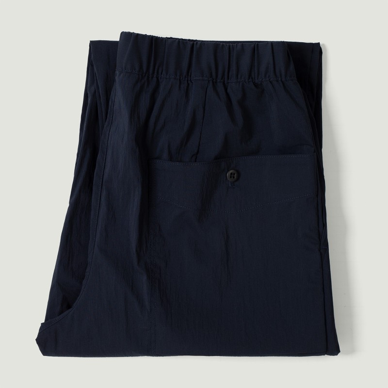 Il est fabriqué dans un tissu Crepe conçu à partir d'une chaîne composée de coton ultrafin et d'une trame tissée avec des fils de nylon et de polyester traités. La différence de rétrécissement entre le coton et les fibres synthétiques produit un effet de froissement naturel et apporte une texture craquante au tissu. En résulte un pantalon extrêmement léger et fin, avec une bonne extensibilité et des propriétés de séchage rapide. Le fil lui-même absorbe l'humidité, de sorte que le pantalon ne devient pas étouffant et peut être porté confortablement, même en été.