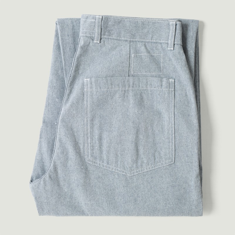 Cette version est confectionnée dans le tissu Jean Cloth Reworked, un denim léger fabriqué à partir de coton post-consommation : le denim usé est collecté, trié par couleur, déchiqueté, recyclé en fils et tissé avec du coton brut pour créer un tissu de qualité au toucher proche d'un denim. Ce procédé confère au tissu des nuances subtiles et une texture intermédiaire entre coton classique et denim, pour une esthétique indigo plus nuancée et contemporaine.