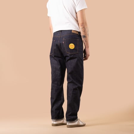 La teinte profonde est obtenue par une teinture en corde à l’indigo, procédé traditionnel qui permet au denim de développer une patine riche et contrastée. Les détails sont fidèles aux standards du denim vintage : braguette à boutons en fer, coutures réalisées avec du fil de coton, rivets en cuivre, patch en papier et liseré selvedge blanc et jaune visible sur l’ourlet.