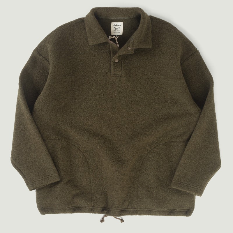 Pour cet hiver, le label japonais nous propose le Wool Himo Polo, fabriqué dans un tricot italien en laine, justement dégraissée pour offrir un toucher sec mais soyeux. Pour être porté confortablement, sans impression de poids trop important, la laine est tricotée lentement, en douceur, et associée à un léger pourcentage de polyester permettant d'en accentuer la solidité et la tenue. Le col polo, pourvu de 2 boutons pression mats ton sur ton, pourra se porter remonté afin de protéger efficacement le cou du froid.