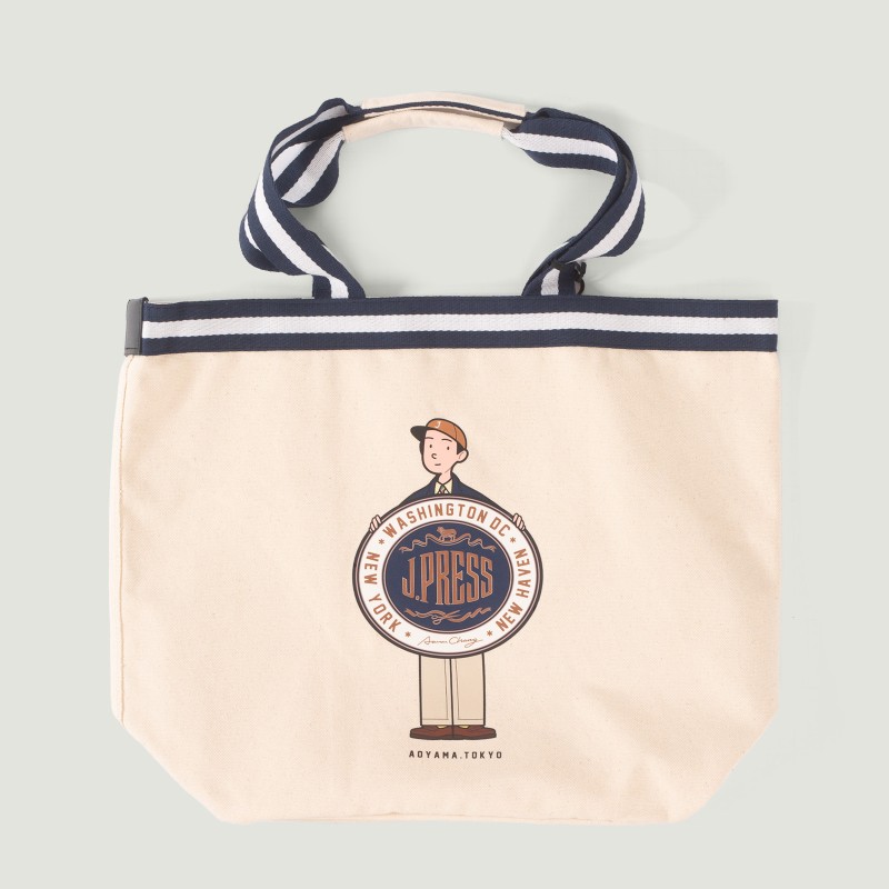 Ce Tote Bag Cotton Canvas est issu de la collection J. Press Boy’s, fruit d’une collaboration avec le célèbre illustrateur Aaron Chang. Avec son style graphique unique et ses couleurs classiques, ce sac incarne une approche moderne et artistique du style universitaire traditionnel.