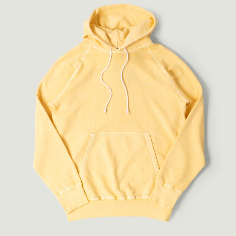Pour expliquer cela simplement, si vous coupez le vêtement en deux, vous constaterez que le cœur du coton est resté blanc. La coloration n'intervient qu'en post-production, une fois le sweat confectionné. Avec la teinture pigmentaire, le colorant ne pénètre pas le tissu en profondeur, il ne colore que la surface du vêtement.