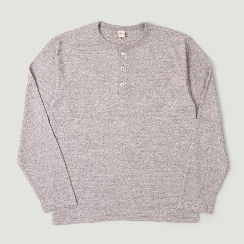 Avec le Lot 5907, le label japonais Warehouse & Co nous propose sa version du henley. Confectionné dans un jersey 100% coton, tissé à basse tension à partir de fils à l'irrégularité prononcée, on obtient une pièce texturée avec un joli coton flammé. Léger, fluide et doux à la fois, ce henley Lot 5907 est très confortable à porter. Notons que le tissage loopwheel, réalisé à partir d'anciennes machines circulaires des années 1920, permettra de conserver son confort lors des futurs lavages. L'ouverture de col à 3 boutons renforcée et les coutures en point de surjet viennent assurer une tenue et une résistance accrue des finitions. Véritable gage de qualité de fabrication, le montage tubulaire (sans couture latérale) permet d'obtenir un joli tombé, ainsi qu'une meilleure durabilité face aux ports et lavages. Sur ce modèle, on notera que les manches sont relativement longues : il sera toujours possible de les retrousser ou de faire quelques revers. Ici décliné dans un joli et contrastant Heather Grey, ce henley se fondera aisément dans une multitude de silhouettes !