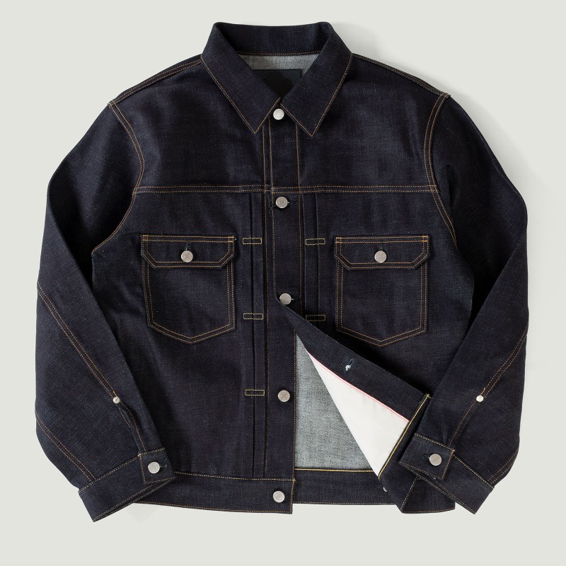 La #002 Standard Denim Jacket de Momotaro Jeans est confectionnée dans le tissu exclusif "TOKUNO BLUE", reconnu pour sa teinte indigo profonde et sa texture unique. Ce denim selvedge de 14.7oz, tissé sur d'anciens métiers à navette à Okayama, a été spécialement conçu pour offrir un plaisir de port malgré sa rigidité, la veste étant sanforisé mais non lavée. Pour intensifier la couleur indigo des fils de chaîne, la composition du tissu a été repensée et des fils de trame plus fins ont été sélectionnés, permettant un contraste plus net et une main plus souple.