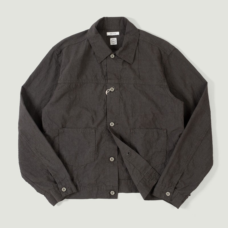 Cette veste, inspirée d'ancienne vestes de chasse, est confectionnée dans un tissu tissé à haute densité, un mélange lin/coton permettant de bénéficier de la respirabilité et du relief du lin, ainsi que de la douceur et de la tenue du coton. La teinture au charbon Binchōtan confère au tissu des nuances profondes et naturelles qui mettent en valeur la structure du textile et sa patine avec le temps. Le Binchōtan est un charbon végétal épais, fabriqué à partir de chêne Ubamegashi, connu pour ses vertus thermiques et sa capacité à absorber les goûts et odeurs indésirables.